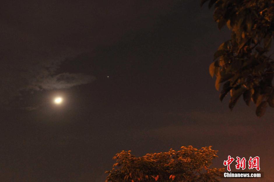 5月4日晚,海南省海口市西南上空出现“木星合月”。中新社发 潘华清 摄