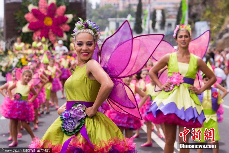 当地时间2014年5月4日,葡萄牙马德拉,马德拉自治区首府丰沙尔庆祝鲜花节,狂欢者身着彩色花衣游行。