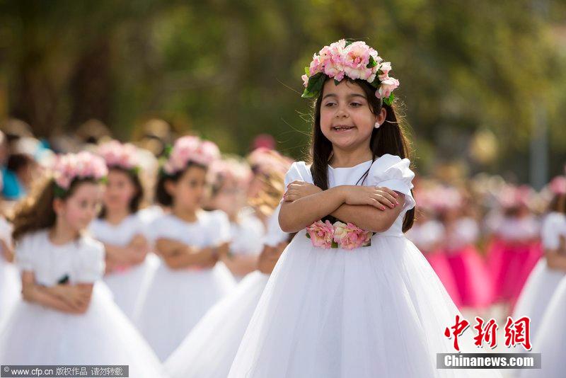 葡萄牙庆祝鲜花节 狂欢者穿五彩花衣翩翩起舞
