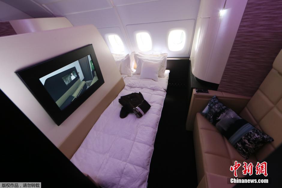当地时间2014年5月4日,阿联酋阿布达比,阿提哈德航空为那些觉得一等舱现有空间太过狭窄的乘客提供了一个迷你套房,套房拥有封闭的卧室、独立的卫生间和一个随时为乘客提供服务的管家。