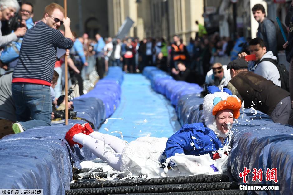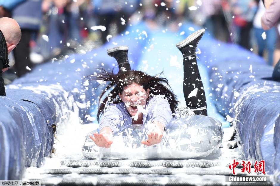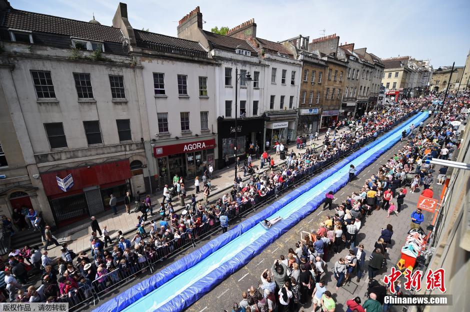 当地时间2014年5月4日,英国布里斯托尔,民众街头体验艺术家Luke Jerram设计的一个长达90米的超长滑水装置,街道瞬间变身疯狂游乐场,据了解,此次活动有超过95000人报名参加,但有幸能体验超长水滑梯的只有360人。