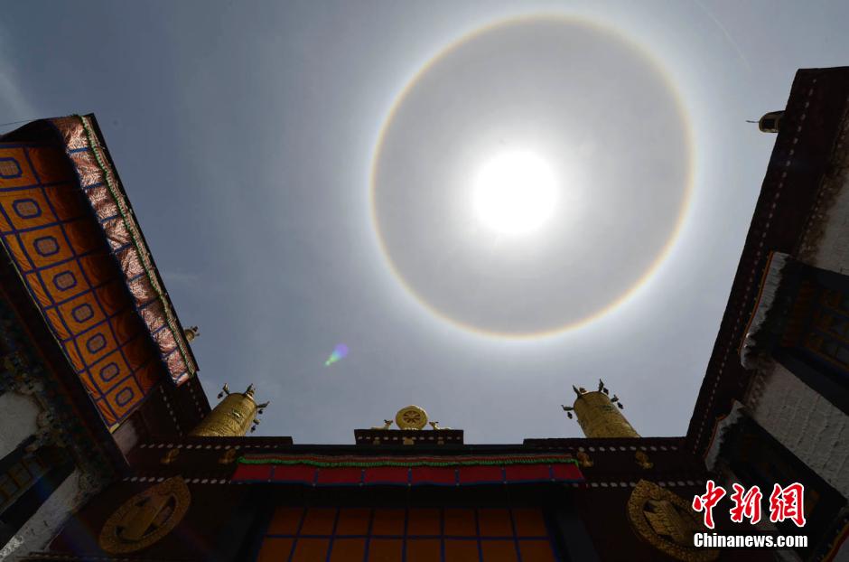 5月5日,拉萨上空出现日晕奇观。日晕是一种大气光学现象,是日光通过卷层云时,受到冰晶的折射或反射而形成的。李林 摄