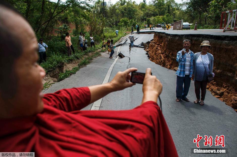 当地时间2014年5月6日,泰国清莱,当地居民在坍塌的路面上拍照。5月5日,泰国北部清莱府傍晚发生里氏6.0级地震,首都曼谷及邻国缅甸仰光均有强烈震感。