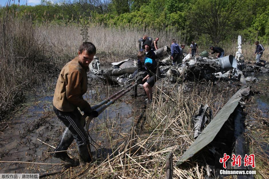 当地时间2014年5月6日,乌克兰Raigorodok,乌克兰军方直升机被摧毁,当地居民捡直升机零部件。该飞机原本是接受命令于周一缓解斯拉维扬斯克的紧张局势,结果在Raigorodok紧急迫降,随后被乌克兰军方摧毁,目的是不让其落入叛乱部队手中。