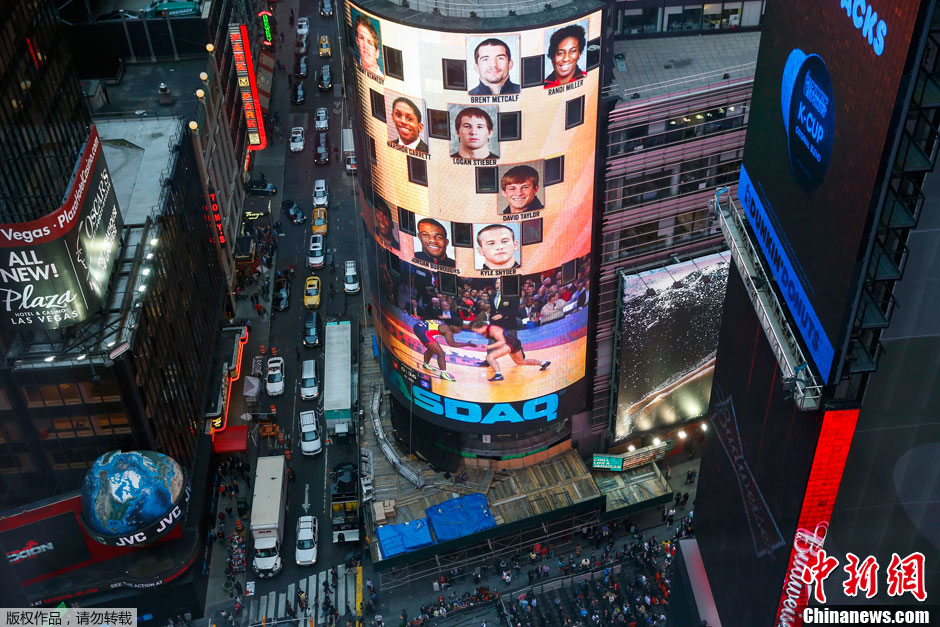 纽约时报广场举行摔跤赛 街头肉搏引围观