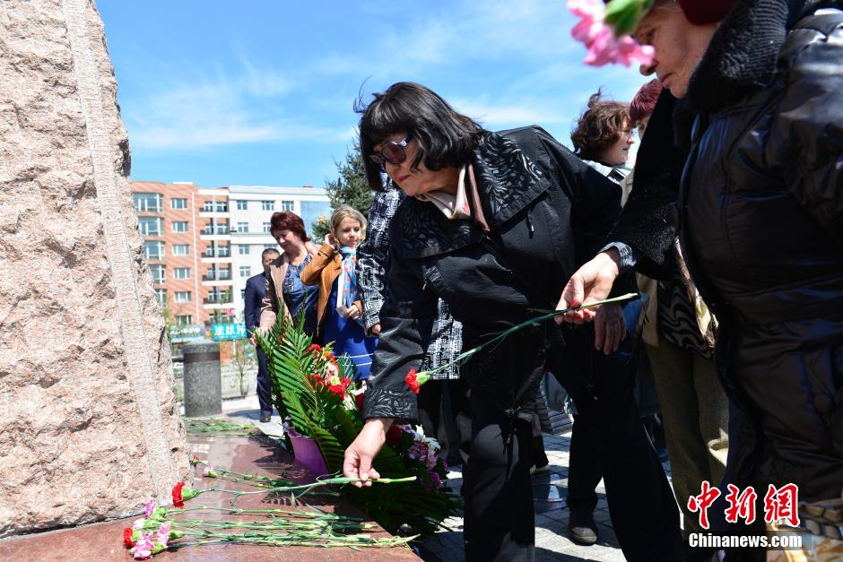 5月7日,俄罗斯波格拉尼奇内市的二战老兵和模范代表一行45人来到黑龙江绥芬河市,向坐落在市区的和平天使嘎丽娅纪念碑献花,纪念这位在二战中献出生命的中俄混血姑娘,缅怀在反法西斯战争中牺牲的烈士。在抗战期间,17岁少女嘎丽娅赴侵华日军要塞劝降日军、解救平民时被杀害。中新社发 张江 摄