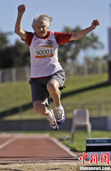 库特尔库1919年3月2日出生,今年已是95岁的高龄。她直到77岁才开始参加训练,到世界各地征战各项比赛,最重要的是,她可不是打酱油跑龙套,迄今为止得到的奖牌挂满衣柜。跳高、标枪、推铅球、撑杆跳或短跑这些运动项目,库特尔库样样拿得起放得下。图为库特尔库跳远。