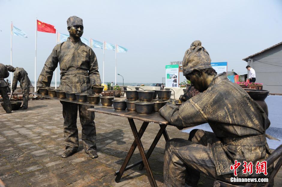 5月8日,以“千年唐风陶城两岸创意文苑”为主题的2104海峡两岸文创名人名企长沙(铜官)行活动,在长沙举行。现场的活人行为艺术,吸引了参观者的驻足观看。工作人员用这种特殊的方式展示长沙铜官窑的发展。据了解,长沙铜官窑始于初唐。盛于中晚唐,终于五代,时间延续300多年。其烧制出来的瓷器品种丰富,美观精致,实用性强。长沙窑是中国釉下彩绘的第一个里程碑,为唐以后的彩瓷发展奠定了基础。 杨华峰 摄