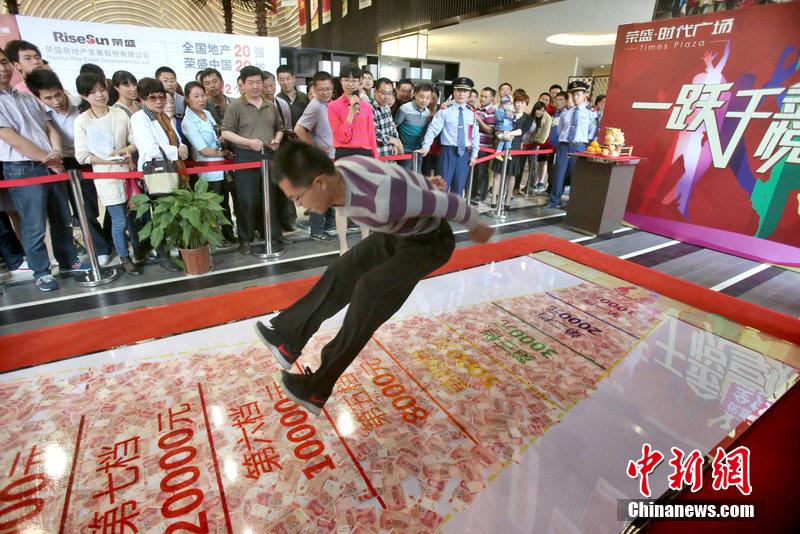 2014年5月8日,南京,红地毯可能司空见惯,但用钱铺成的星光大道你见过吗?荣盛时代广场售楼处里用10万人民币铺在地上,不少来选购商铺的人都感叹见识到什么叫“真土豪”了。“开盘优惠X点,首付X成优惠X点,一次性付款X点……”这样的优惠在买房时是寻常见到的。但荣盛时代广场今日认筹时,举办了一出别具匠心优惠活动,购铺者立定跳远,跳多远,就优惠多少。