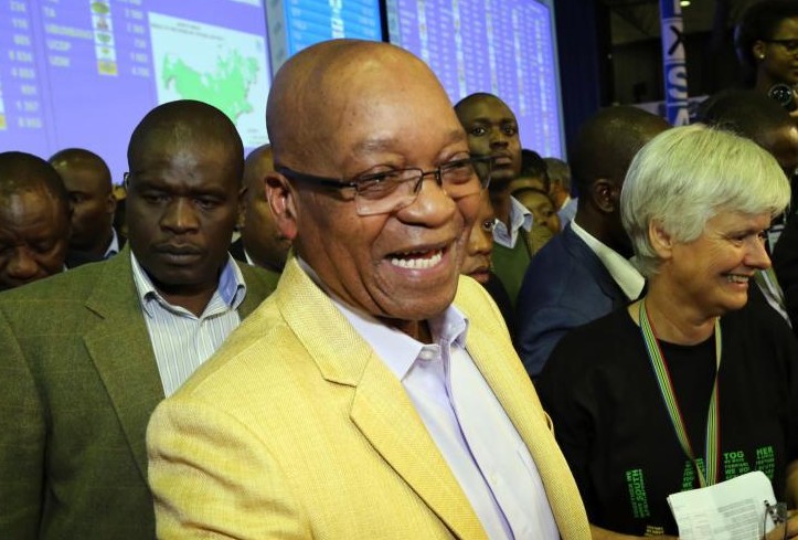 南非第五次全国大选于2014年5月8日开始计票。经过整整一天的统计,执政党非洲人国民大会(非国大)的得票数已经超过总有效票数的50%,提前锁定胜局。同时,非国大也将继续获得南非9个省中的8个的执政地位,而民主联盟则继续其在西开普省的执政地位。当晚8时许,南非总统祖马赶到大选运行中心,看望各政党代表并与支持者欢庆胜利。图为祖马看到非国大得票领先后开怀大笑。中新社发 宋方灿 摄