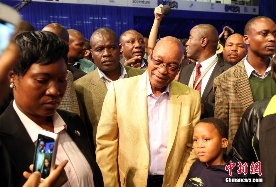 南非第五次全国大选于2014年5月8日开始计票。经过整整一天的统计,执政党非洲人国民大会(非国大)的得票数已经超过总有效票数的50%,提前锁定胜局。同时,非国大也将继续获得南非9个省中的8个的执政地位,而民主联盟则继续其在西开普省的执政地位。当晚8时许,南非总统祖马赶到大选运行中心,看望各政党代表并与支持者欢庆胜利。图为祖马与南非儿童摆拍合影留念。中新社发 宋方灿 摄