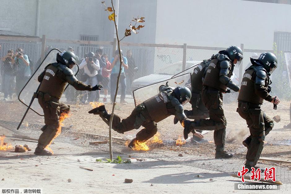当地时间2014年5月8日,智利圣地亚哥防暴警察与抗议者发生冲突,抗议者向警察扔汽油弹,在逃跑过程中,防暴警察绊倒,身上着火。数万名学生参加游行抗议,要求政府实施教育改革。