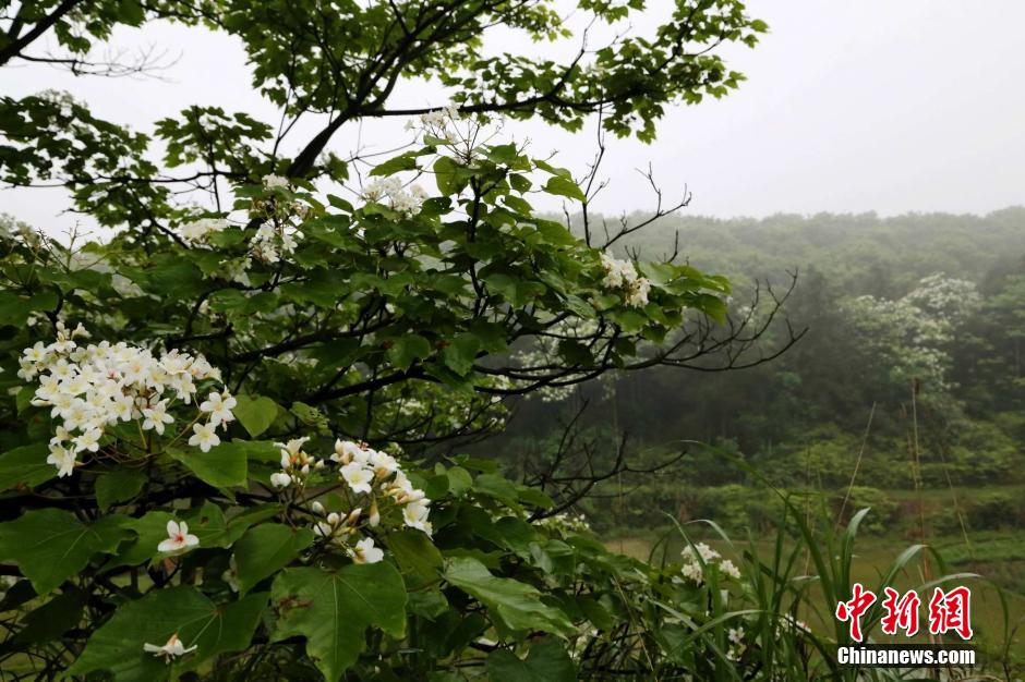 5月8日,位于广西融安县长安镇209国道旁山坡上,数百余棵油桐花同时盛开,延绵数公里,满山遍野百花点点,令不少过往车辆停车驻足、拍照留念。油桐树结果后可以提炼桐油,桐油是当地的船家用于龙舟、木船、渔具的防水、防腐涂料。卫纲 摄
