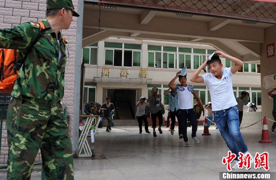 5月11日,学生们在民防志愿者的指导下模拟演练应急疏散。当日,来自安徽省合肥市杏林街道的民防志愿者为合肥市建设学校的学生们讲解了民防应急、自救互救的知识,学生在民防志愿者的指导下模拟演练应急疏散。中新社发 韩苏原 摄