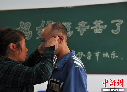5月11日,安徽省九成监狱马家湖监区内,一位服刑人员的母亲为儿子带上新买的眼镜。中新社发 韩苏原 摄