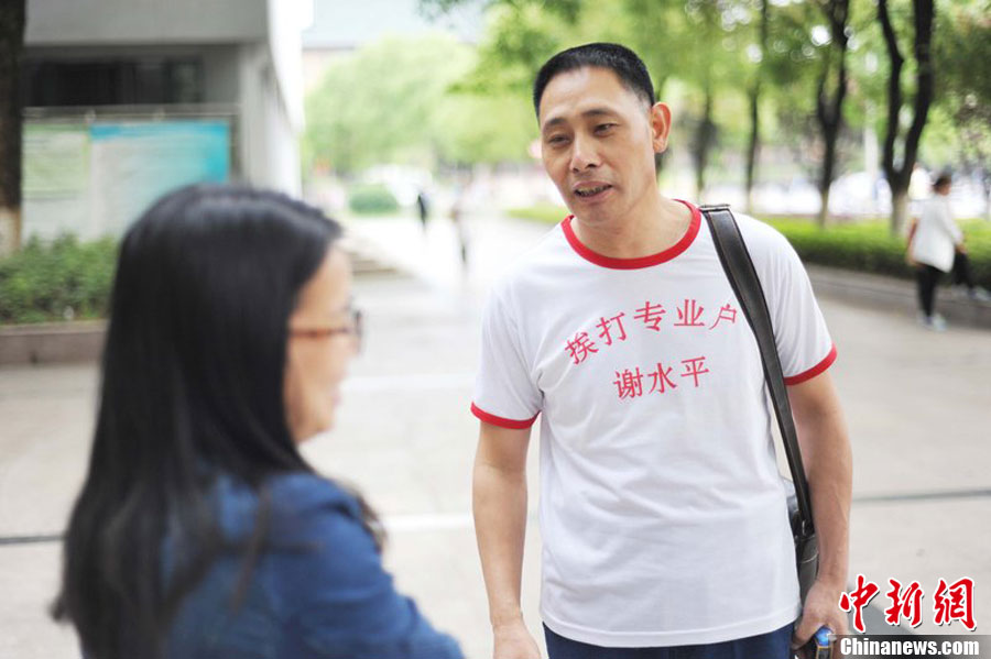 5月11日,谢水平来到武汉体育学院及武汉街头,接受体育专业学生和过往路人挑战,不管对方用拳、用掌或是用脚,都未能将其打得全身而退。湖北安陆人谢水平将“挨打”当成了自己的职业,走南闯北每月有2万到3万的收入。如今,这名“挨打专业户”独自来到江城武汉“找打”。承影 摄