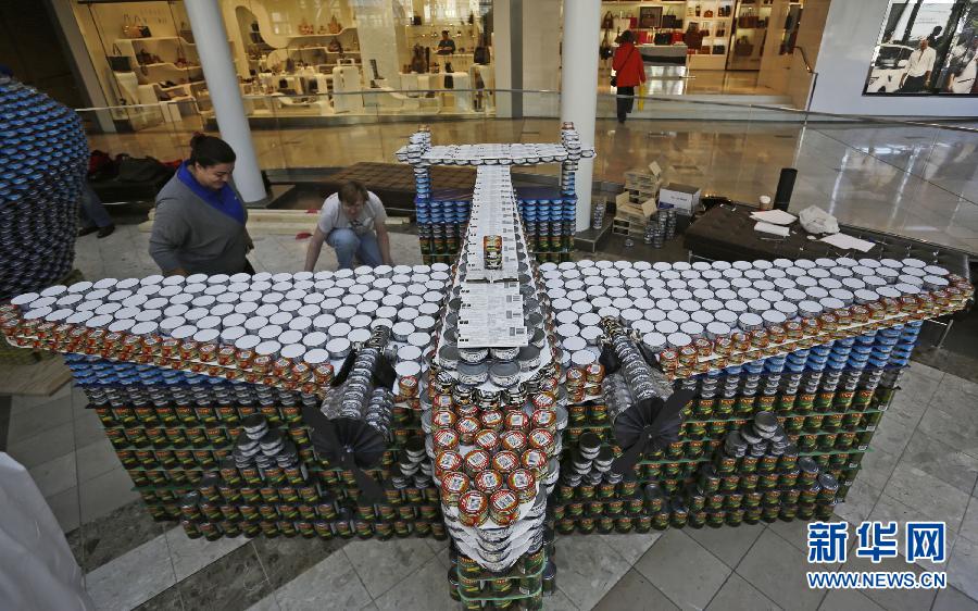 当日,温哥华举行2014年罐头雕塑大赛。当地民众组成的19支队伍利用捐赠得来的食物罐头,搭建成各种各样的雕塑展示在市中心各处。大赛所用的6.5万个罐头之后会捐赠给当地的食物银行,以帮助贫困人群。新华社发(梁森摄)
