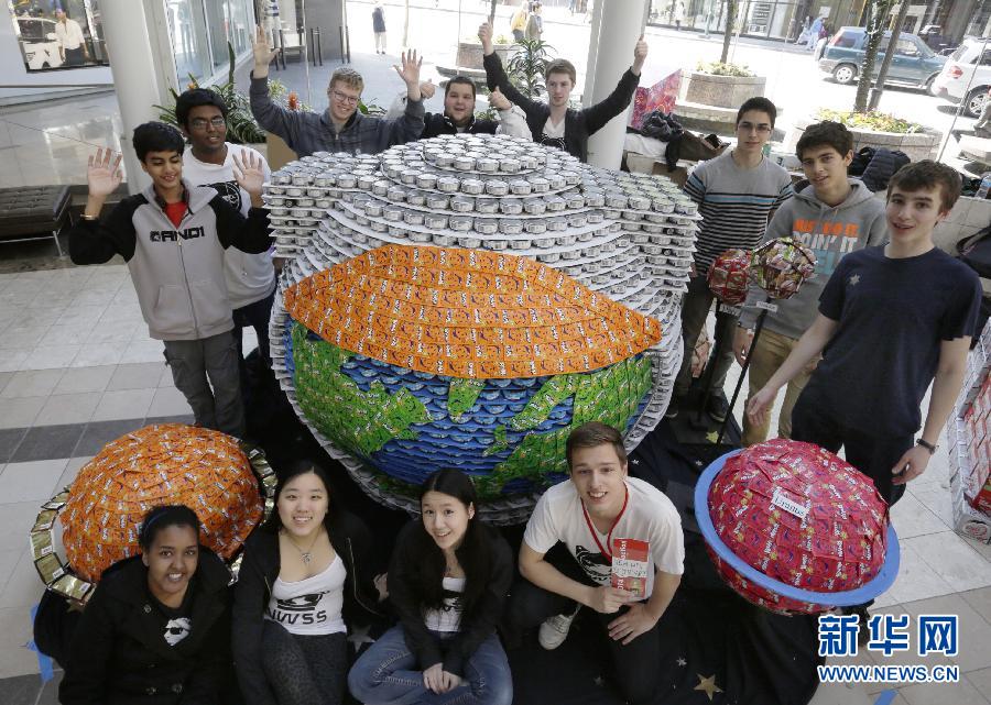 5月11日, 在加拿大温哥华,参加罐头雕塑大赛的人们完成作品后合照留念。新华社发(梁森摄)