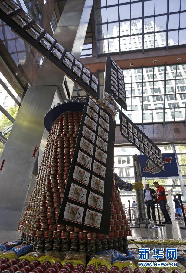 这是5月11日在加拿大温哥华的罐头雕塑大赛上拍摄的风车造型雕塑。(梁森摄)