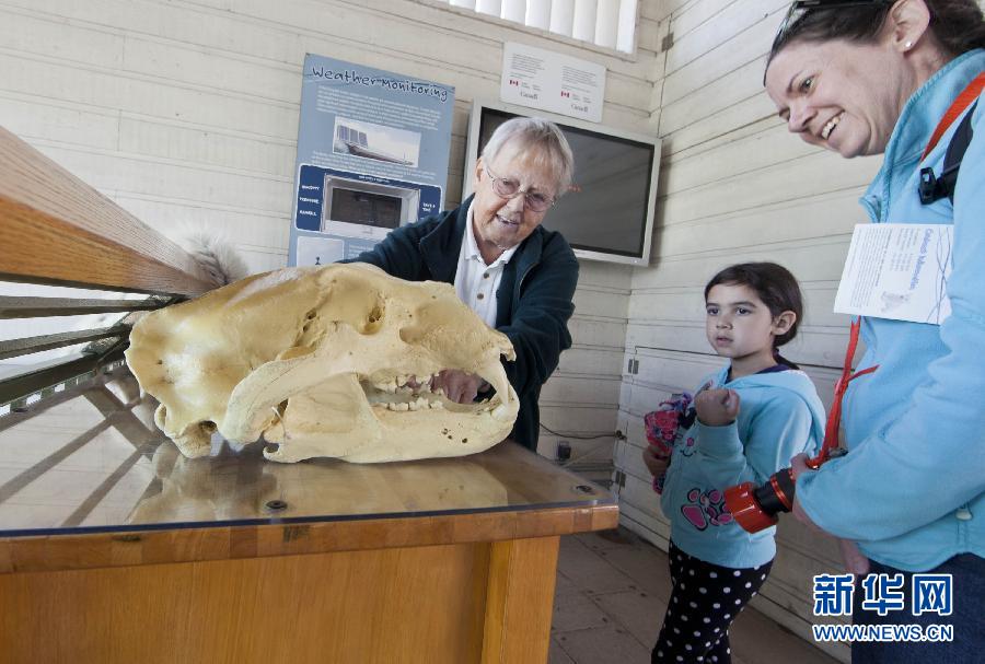 5月11日,在加拿大多伦多动物园,一位母亲带着孩子观看北极熊头骨并了解其习性。新华社发(邹峥摄)