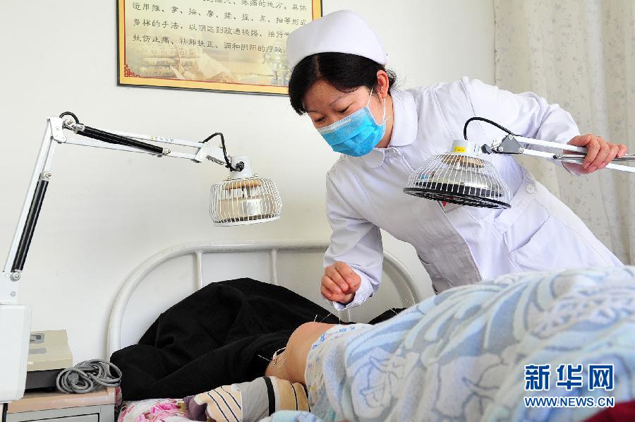 5月12日,宁夏银川长城花园社区卫生服务站的护士杨月仙在为一位居民做针灸治疗。