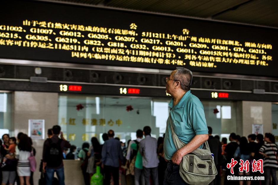 5月12日,广州南站售票大厅的公告显示,中午12时前,广州南站开往深圳北、潮汕方向的动车组列车临时停运。是日,广州铁路(集团)公司官方微博发布消息称:12日凌晨,铁路部门组织对广深港高铁沿线巡查维护中发现,深圳北至光明城区段有一处山坡发生泥石流。为确保动车组列车运行安全,铁路部门决定,5月12日中午12时前,广州南至深圳北区段内所有动车组列车临时停运。中新社发 龙宇阳 摄
