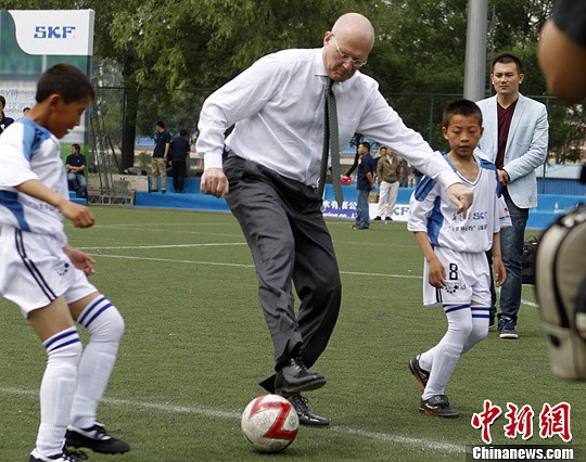 5月13日,瑞典驻华大使罗睿德与来自中国西部地区的希望小学学生一起踢足球。中新社发 苏丹 摄