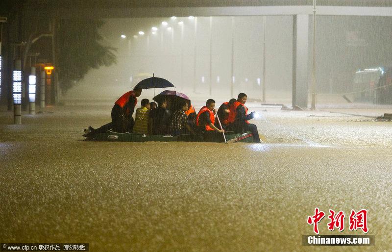2014年5月12日凌晨2点多,东莞塘厦。塘厦大道长埔村路段积水严重,水深1米多,消防公安求援出动橡皮艇,驶入水浸道路沿线转移被困群众。陈奕启 摄