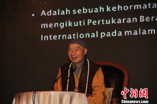 5月13日晚,祖籍中国安徽的净空老教授在雅加达出席印尼国际多元文化交流晚宴上致辞倡议,多元宗教团结,推进汉学与多元化,能促进世界和平,他提倡继承与发扬中华民族优秀传统文化。顾时宏 摄