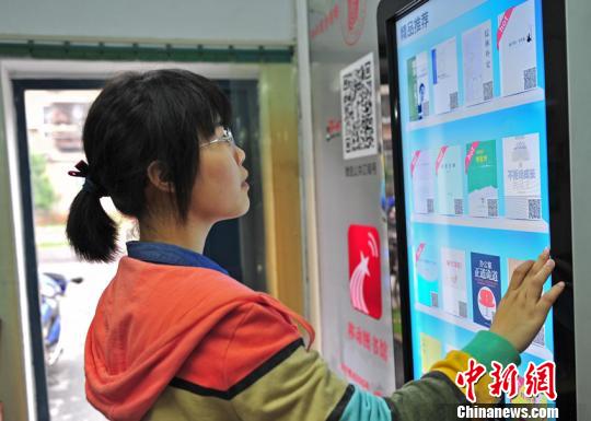 5月14日,湖北省宜都市的市民在电子图书馆借阅终端上下载自己喜欢阅读的电子图书。当天,该市电子图书馆正式建成并开馆,其电子图书馆终端内置2000多册文学艺术、政史军事、科学技术、生活保健等12类畅销书,每月自动更新200册。不用办证,无需付费,只需用手机和平板电脑扫一扫,即可快速借阅书籍,深受市民欢迎。该电子图书馆开馆首日,有200多位读者下载了各类图书。
