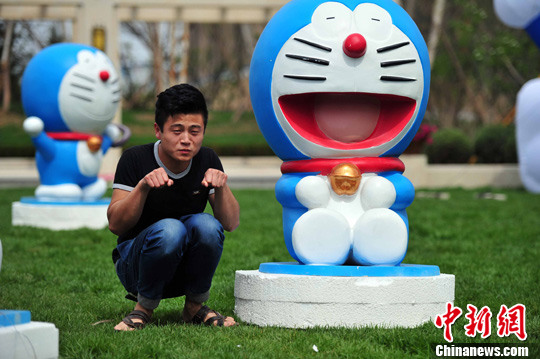 图为市民在与机器猫合影。中新社发 于海洋 摄