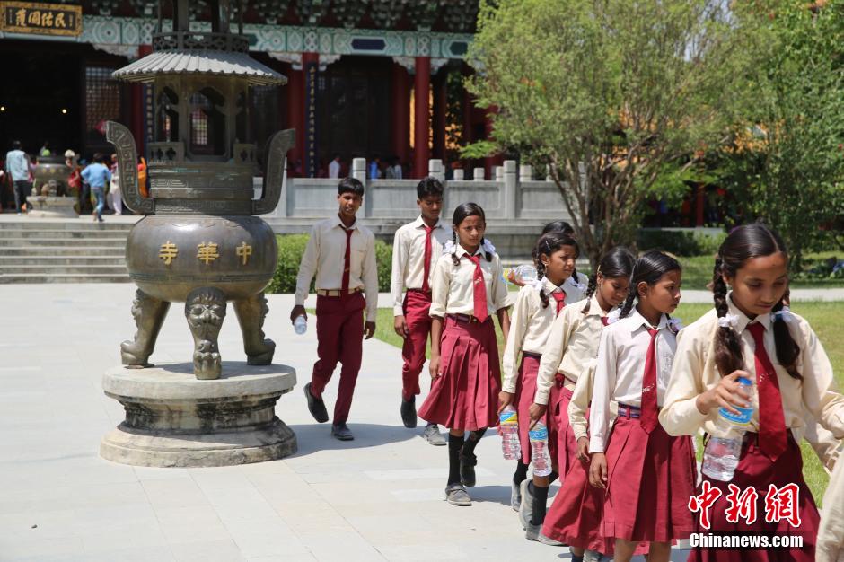 5月14日是尼泊尔传统节日“佛诞节”,在该国“佛祖故乡”蓝毗尼,来自世界各地的佛教信众朝拜佛祖释迦牟尼的出生地“圣园”。当天,尼泊尔政府与蓝毗尼发展委员会在“圣园”举行盛大集会,吸引了近千人参加。当地民众冒着酷暑,身着盛装,现场表演了孔雀舞、手鼓等节目,表达对佛祖的崇敬。图为尼泊尔总理苏希尔·柯伊拉腊与中国国家宗教事务局副局长陈宗荣在“佛诞节”庆祝活动上互相致意。中新社发 符永康 摄