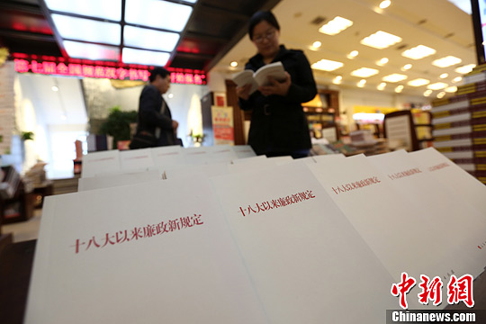 5月14日,山西太原解放路新华书店,民众阅览《十八大以来廉政新规定》。据工作人员讲,该书上架首日销售超过3000册。中新社发 武俊杰 摄