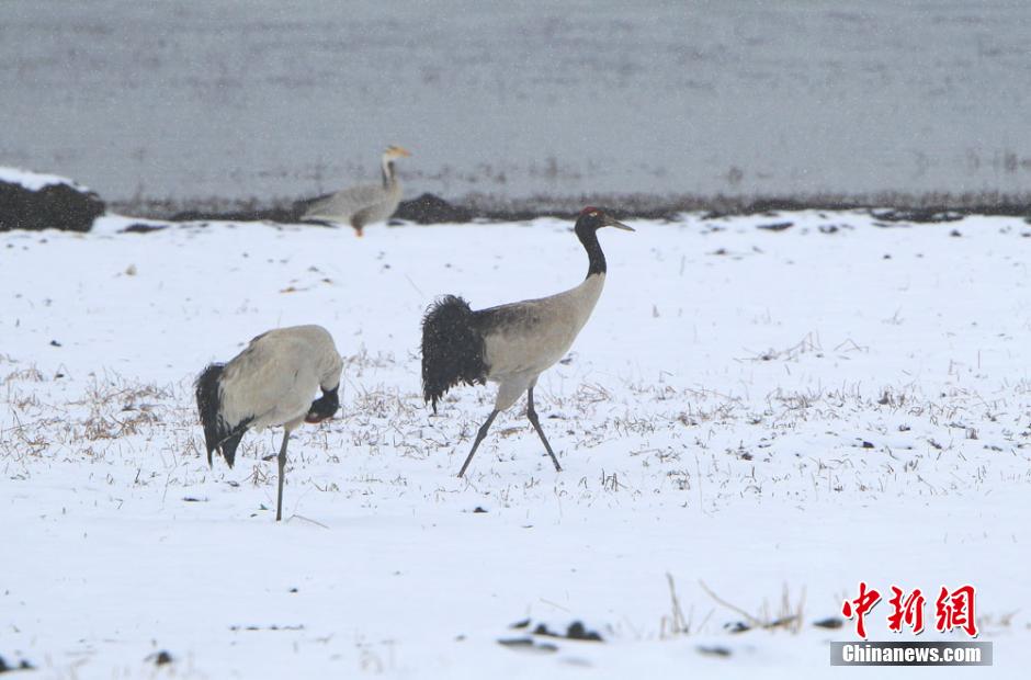 甘肃甘南五月飞雪 黑颈鹤尕海湖畔意外“遇冬”