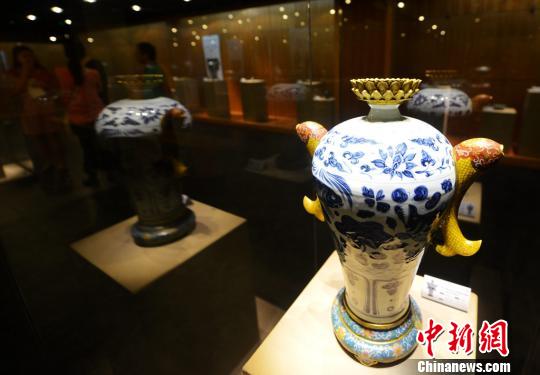 图为厦门首个海峡两岸文物展览专场《宋元古瓷萃》收藏展上展出的元代青花铜鎏金掐丝瓶。 张斌 摄