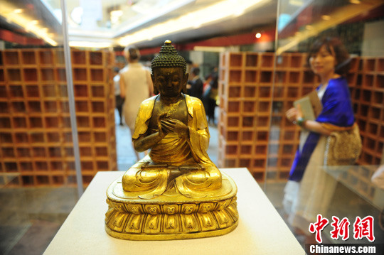 5月15日,深圳文博会分会场“天物”名家典藏文物艺术展在华侨城欢乐海岸购物中心展出,其中包括鎏金铜释迦牟尼佛、掐丝珐琅云龙纹多穆壶、楠木福禄寿喜木雕等。中新社发 陈文 摄