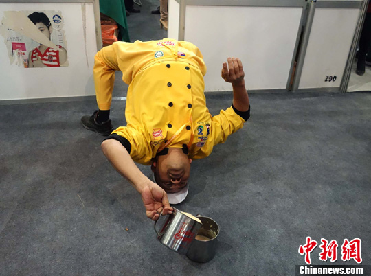5月15日,来自马来西亚的MiopSazaliBinMatAli在第八届中国(青海)国际清真食品及用品展上表演马来西亚特色饮料“拉茶”。拉茶是马来西亚人民所独创,拉茶其实就是奶茶,马来西亚人称为“飞茶”。拉茶是用两个杯子拉来拉去,拉得越长,起泡越多,味道就会越好。中新社发 赵凛松 摄