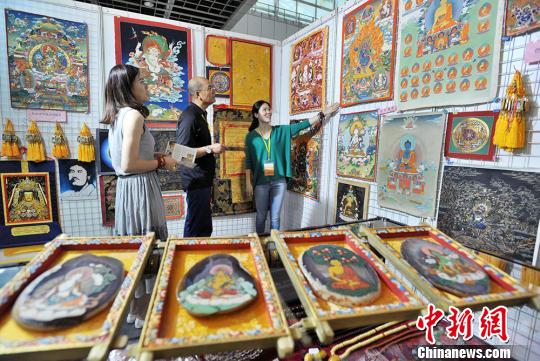 工作人员向观众介绍来自西藏拉姆拉措文化的唐卡艺术作品。泱波 摄
