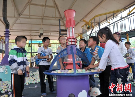 5月18日,重庆农村留守儿童和贫困学生正在涪陵红酒小镇一景区内玩耍各种娱乐设施。中国旅游日临近,重庆涪陵区红酒小镇一景区推出免费游乐活动,针对农村留守儿童、贫困学生及孤儿等困难人群,只要持街道社区、学校及民政部门提供的有效证件可享受1年免费游乐。据悉,此次针对困难人群的免费活动将持续到2015年的中国旅游日为止。