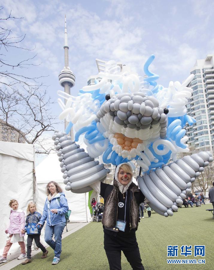 5月18日,在加拿大多伦多,一名小丑展示用气球做的“鲨鱼”。新华社发(邹峥摄)