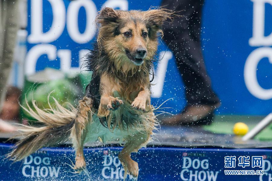 此项比赛旨在测试狗的技能。主人会把一个玩具扔进水池,让狗跳入水中取回。有些狗很享受跳水,有些狗则逃避跳水。比赛规则禁止主人将狗扔进水中。新华社发(弗尔季·奥蒂洛摄)