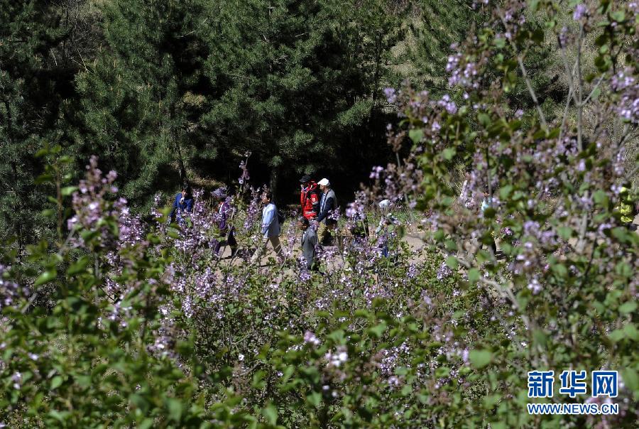 5月19日,游客在宁夏西吉县火石寨景区漫步观赏丁香花。