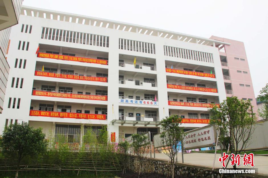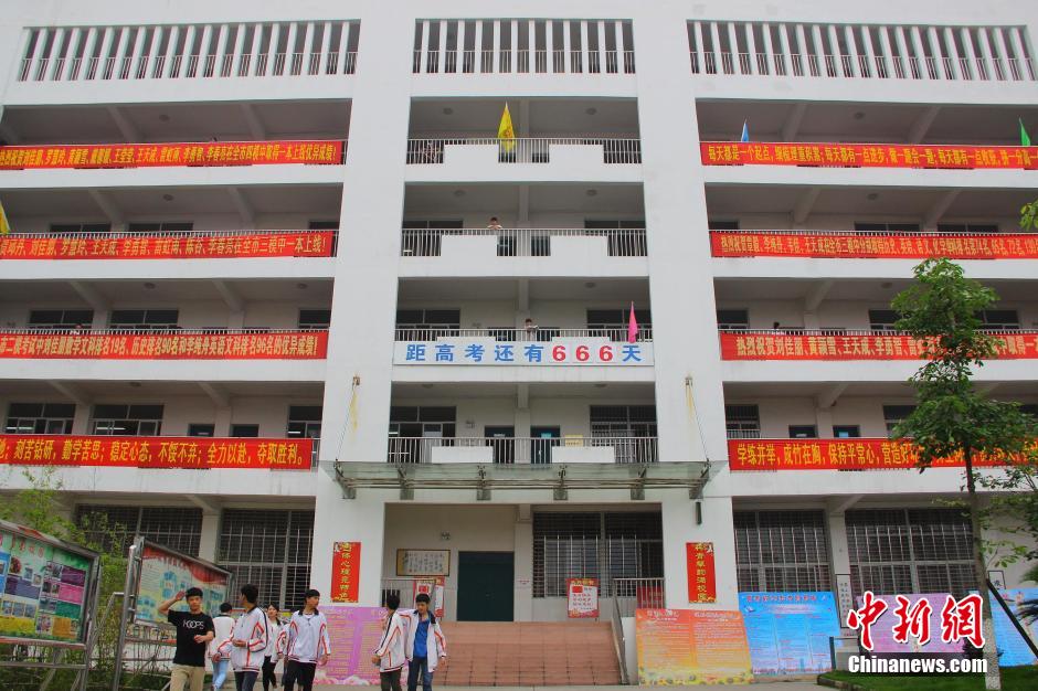 5月19日,广西柳州市第三中学教学楼外悬挂大量励志横幅,激励学生备战高考,并把高考倒计时从往常的倒计时,改换成“666天”的吉祥数字,以消除考生心里压力。据广西招生考试院统计,广西今年有近32万人报名参加普通高考,较上年增加近2万人,增幅超过6%。雷彬 摄
