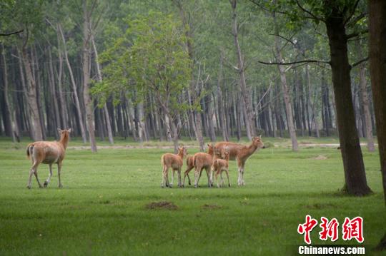 几头麋鹿幼仔和成年麋鹿在一起。周古凯 摄