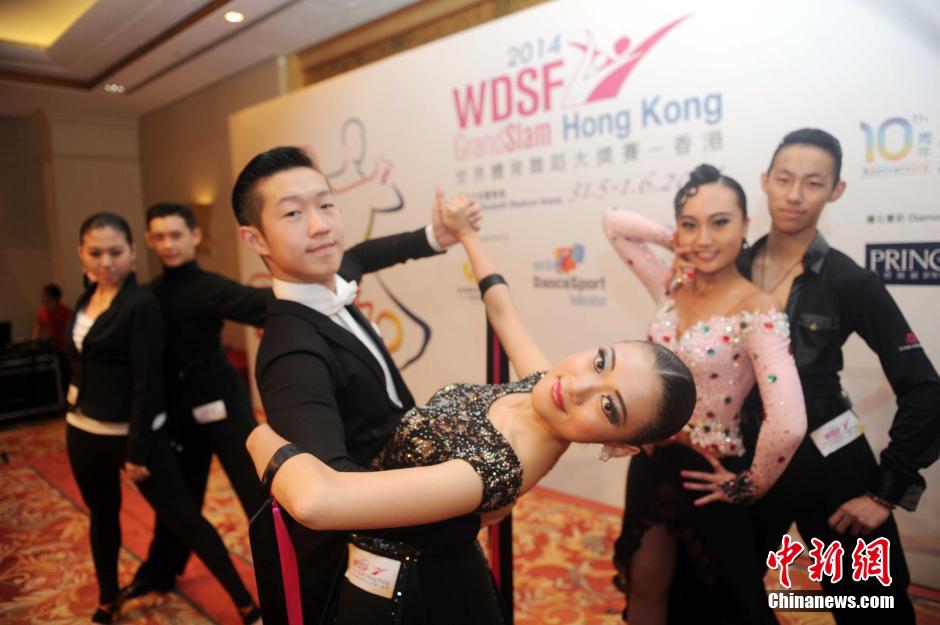 5月19日,嘉宾在记者会上示范舞蹈表演。WDSF世界体育舞蹈大奖赛香港分站,将于5月31至6月1日在湾仔伊利沙伯体育馆举行。中新社发 谭达明 摄