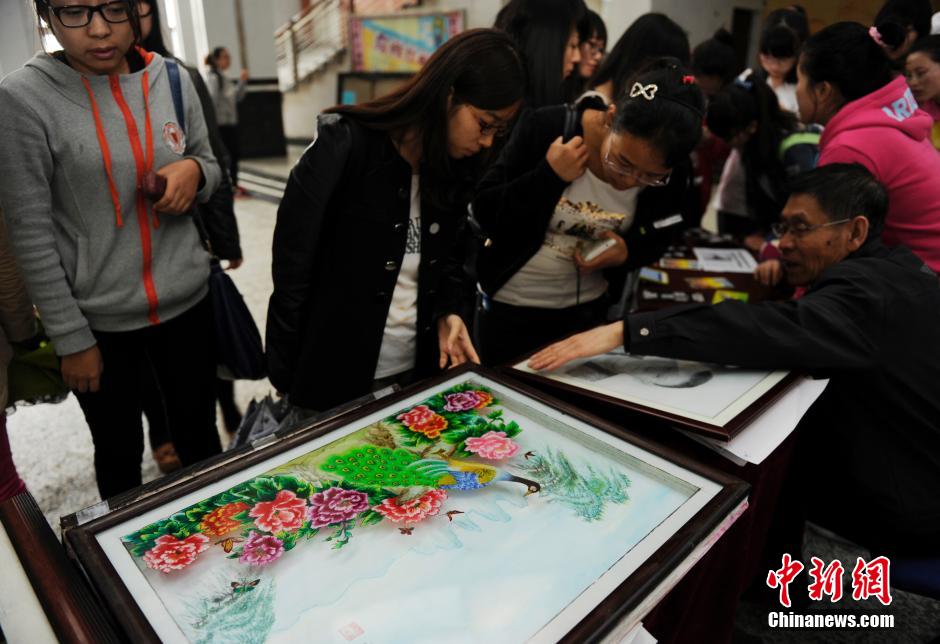 5月20日,在位于长春的东北师范大学北苑食堂一楼,一场小型画展正在这里举行。现场这些精致的纸质画以及较为少见的玻璃画均出自这间食堂的更夫——年逾六旬的孙永福之手。画展举办后,不少大学生都特意赶到他的画展现场索要签名,也有一些学生提出向孙永福“拜师学艺”。张瑶 摄