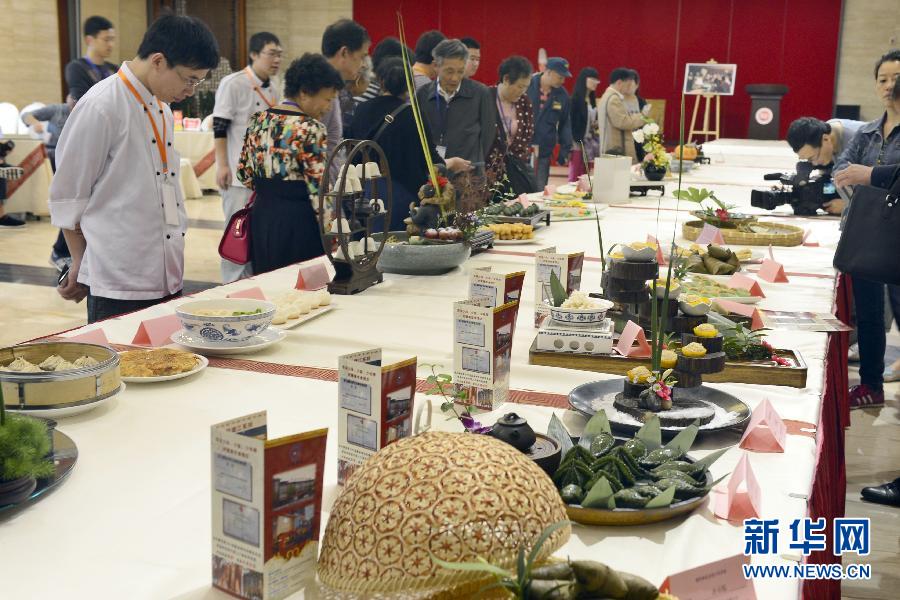 5月20日,观众及点心师们在欣赏参评的中式点心小吃。当日,新杭州名点名小吃评定暨“包容天下”嘉年华活动在中国杭帮菜博物馆启幕,来自杭州市各区县(市)餐饮名店选送的170多道具有杭州地方特色的中式点心小吃参评。评定先由专家评委组根据特色鲜明、流传范围、知名度及口味、工艺、营养卫生等标准,初评出50道入选点心小吃,再经公示和公众投票,最后评定36种“新杭州名点名小吃”。这是继1956年首次评定17道“杭州名点名小吃”后,近60年来再次评选符合新时代口味的杭州名点。新华社发(李忠 摄)