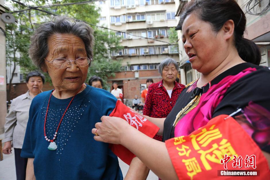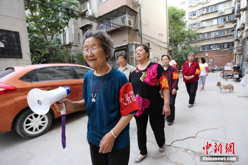 在河南郑州市管城区城东路社区,有一支特别的社会治安巡逻队,经常在社区和街头进行治安巡逻。他们由一些退休在家的老年人组成,人们都亲切地称她们为“夕阳红巡防队”。今年85岁的王桂枝是这个巡防队的队长,她和伙伴们已经坚持义务巡逻了12年。辖区里一些治安案件的成功侦破,都是靠他们提供的线索。社区的居民告诉记者,有了这支“夕阳红巡防队”,他们就像吃了定心丸一样,可以放心地去工作了,不再为家里的安全担心了。图为5月20日,85岁的王桂枝手拿大喇叭带领着巡防队队员在社区巡逻。杨正华 摄