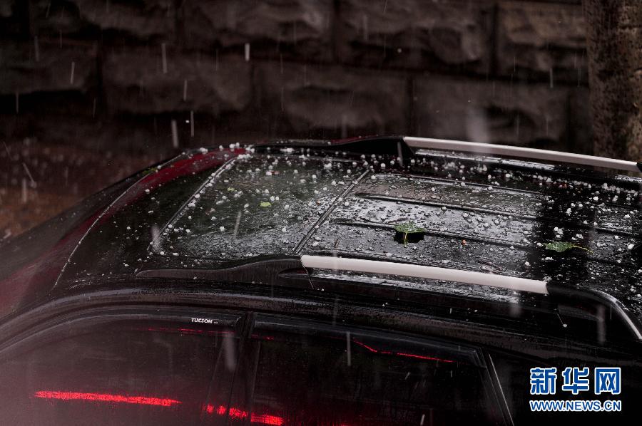 5月21日,冰雹砸到沈阳市区路边停放的车辆上。当日,沈阳市遭遇冰雹天气。沈阳气象部门16时发布雷电橙色预警信号,预计沈阳市区、新民市、法库县将出现雷电天气,并有可能伴有雷雨大风、冰雹等短时强对流天气。新华社发(张文魁 摄)