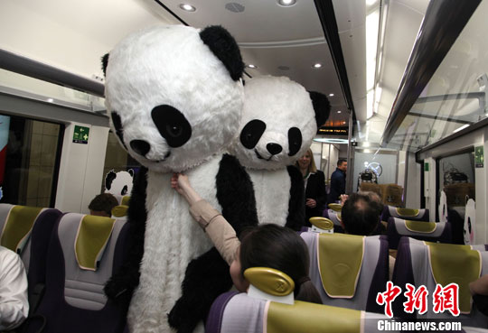 图为工作人员装扮成大熊猫宣传2014伦敦成都周。中新社发 周兆军 摄